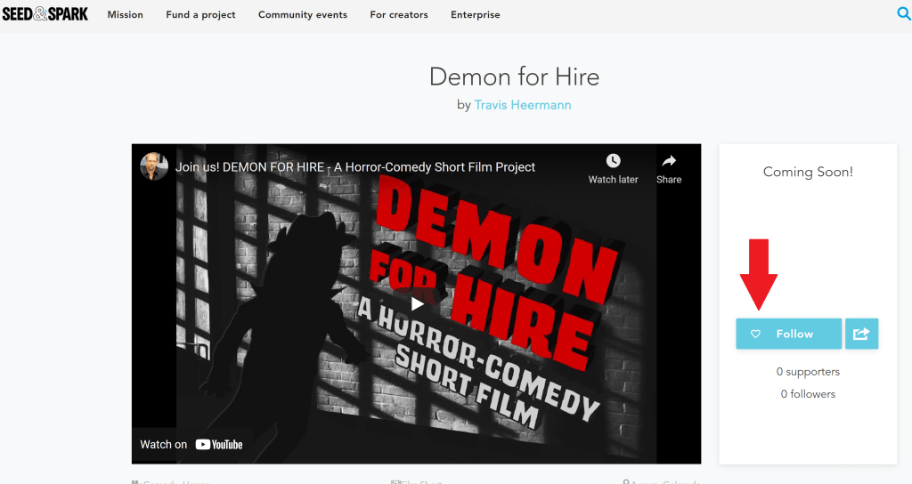 Even if you’re not interested in helping out monetarily (which is totally okay!), a simple FOLLOW is a huge help. If the campaign garners enough Followers, Seed & Spark unlocks some really helpful promotion and distribution bonuses. You can also share the campaign with someone who might love to help. Your siblings, your roleplaying group, your Bad Movie Buddies, anybody who you like to geek out with about horror movies and indie filmmaking.
