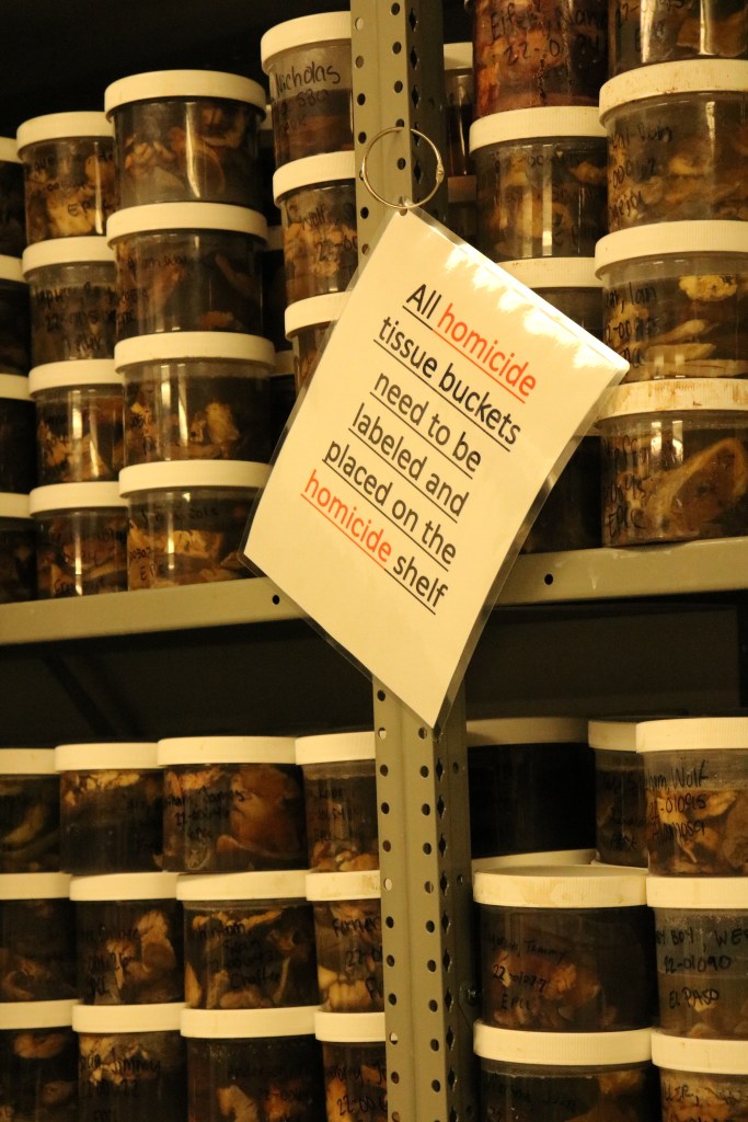 El Paso County Coroner and Lead Medical Examiner, Dr. Leon Kelly, was kind enough to give an informational talk, tour, and Q&A to a group of local writers set up by HWA Colorado. We viewed the autopsy space, the refrigerated area with bodies waiting to be examined, a body, and beetles working at cleaning the tissues from a portion of a skeleton. Here were a few takeaways: