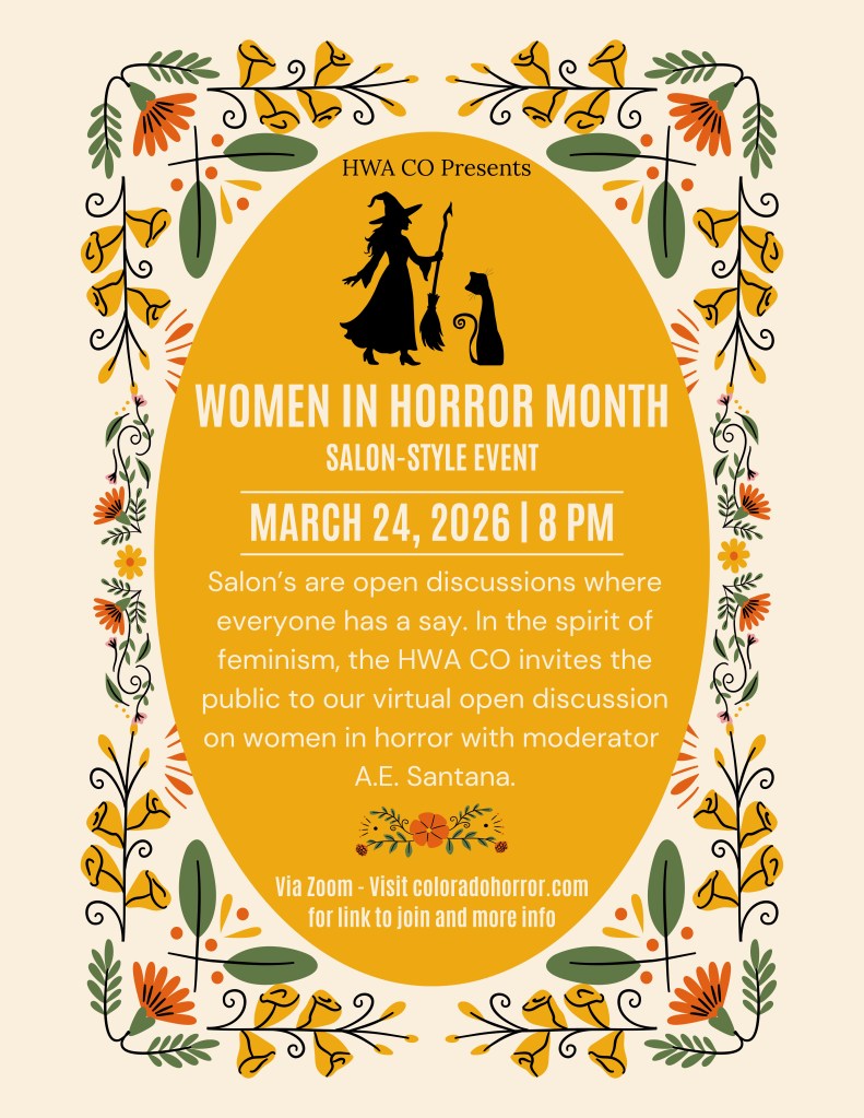 Join the HWA Colorado for a virtual salon-style event for Women in Horror Month (WIHM). Salon’s are open discussion events where everyone has a say. In the spirit of feminism, which is about equality, HWA Colorado invites the public to our WIHM event to discuss their thoughts on women in horror from authors to characters to plots and plot devices. Moderated by A.E. Santana.