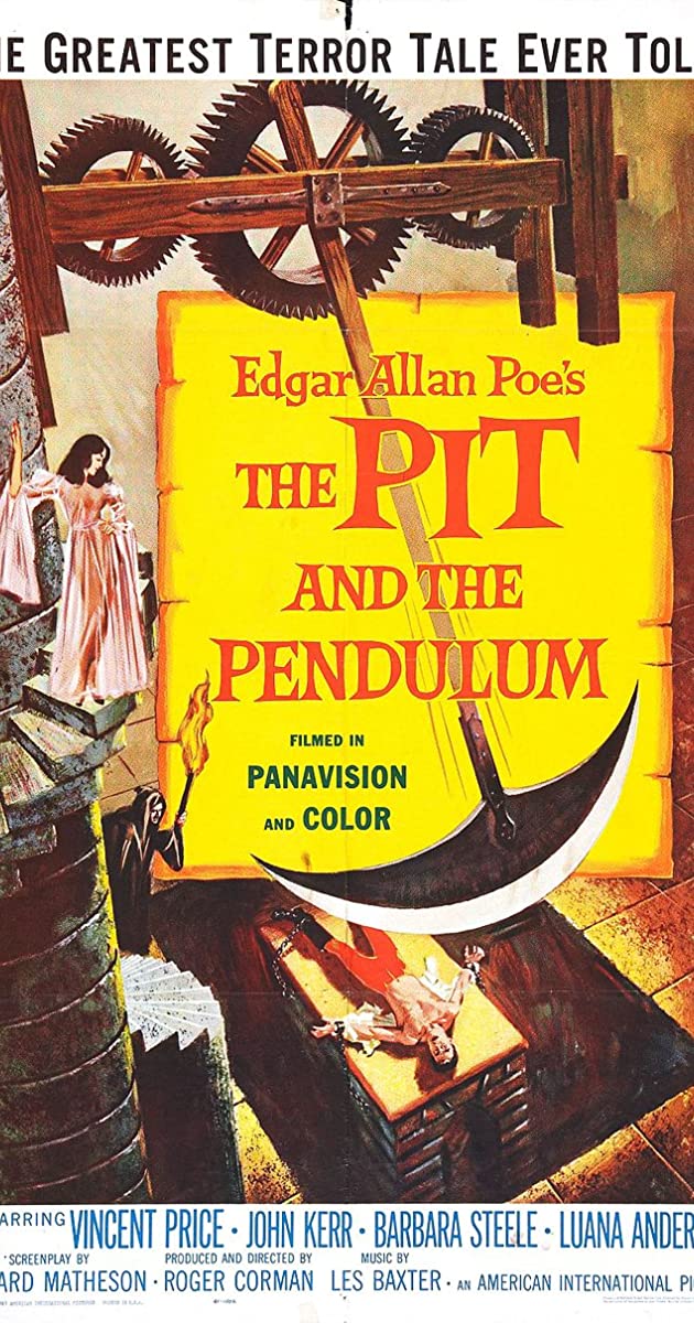 The Castle of Otranto (1764) by Horace Walpole is generally credited as the first Gothic novel (though elements of the genre are much older) and considered by many to be the first Horror novel. Mary Shelly’s Frankenstein: or, The Modern Prometheus (1818) is not only Gothic, but often considered the genesis of the modern Horror genre and the first Science Fiction novel as well. Edgar Allan Poe has been called the American Gothic writer, and his novel, The Fall of the House of Usher (1839), is possibly the quintessential American Gothic novel. Other examples include Dracula by Bram Stoker, The Turn of the Screw by Henry James, The Picture of Dorian Gray by Oscar Wilde, Something Wicked This Way Comes by Ray Bradbury, Salem’s Lot by Stephen King, and Mexican Gothic by Silvia Moreno-Garcia. Gothic Horror movies include Cat People (1942), The Spiral Staircase (1946), Sweeney Todd: The Demon Barber of Fleet Street (2007), Crimson Peak (2015), and, of course, The Pit and the Pendulum (1961).